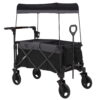 The Navigator Plus 2-in-1 Stroller Wagon is the new and improved wagon option from Baby Trend to fit your family’s unique needs! The large cargo space offers built-in seating for two and includes two 3-point safety harness belts to keep your little ones secure. The dual canopies are independent and will shield both children from environmental stressors, such as the sun. Both canopies are adjustable and can be easily removed when not in use. The durable frame is dependable and will be a trusted addition to all family outings. The wagon’s hide-away pull handle is adjustable and offers a pull wagon option. The stroller handle can be used when in push stroller mode. The stroller handle also includes a parent tray with two cupholders and a center console for added storage. The child tray allows you to easily keep snacks close by with two cup holders and center consoles for each child. The 8″ front and 11″ rear wheels provides a smooth ride for your family whether spending time indoors our outside! A flip over basket can easily be attached to the front or rear of the wagon, adding even more storage capabilities. Little ones will enjoy the extra support with the versatile Seat2Mat. This stroller wagon can hold up to 110 lb and is ideal for babies who can sit up unassisted, toddlers and young children.