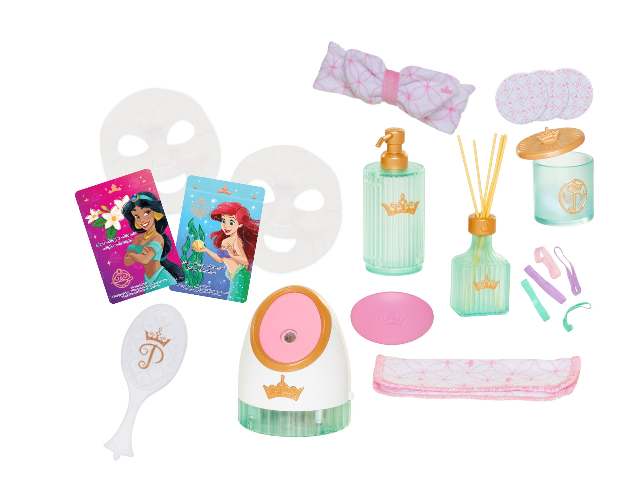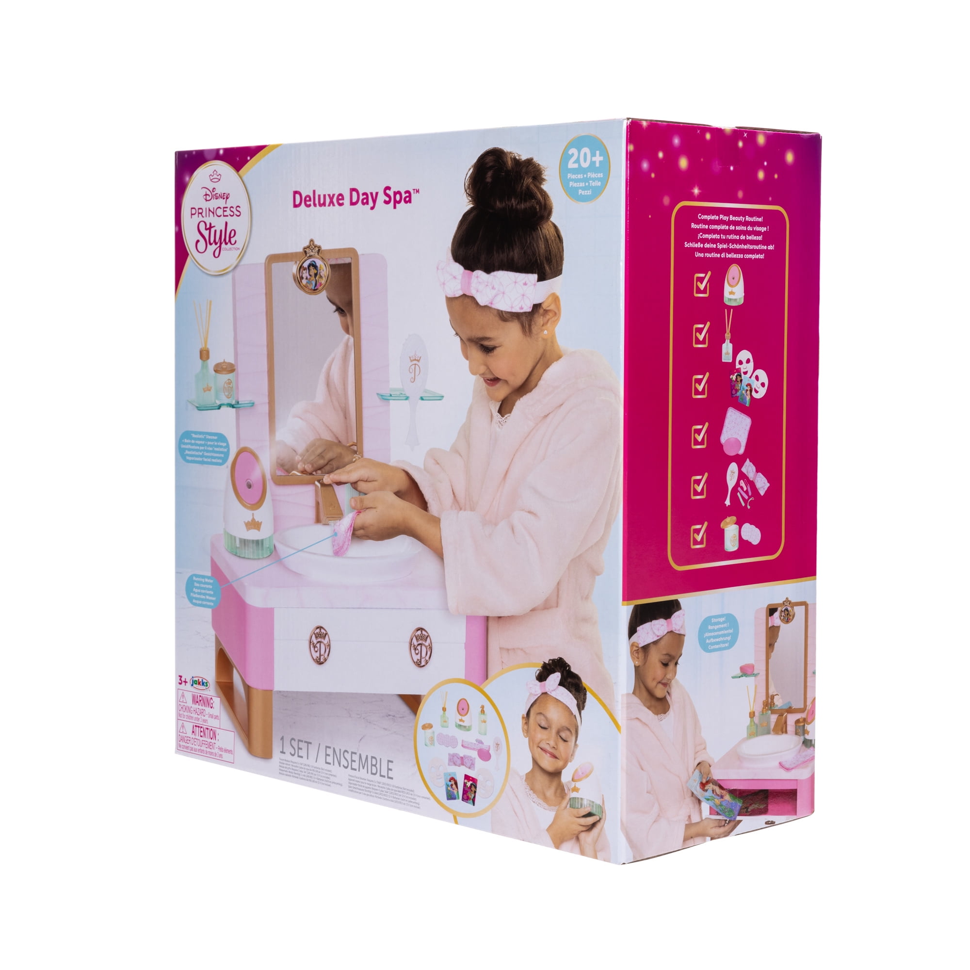 Relax, Refresh, & Renew with the Disney Princess Style Collection Deluxe Day Spa vanity. Features a real working sink and a pretend facial steamer along with the latest play contemporary skincare essentials. With the push of a button, turn on the real working sink with running water. Wash & pretend to “steam” your face with the realistic facial steamer, refresh with a play mask, and unwind in style! Up your self-care game with the spa headband, pretend cleanser bottle, play facial pads, wash cloth and more! Conveniently stash everything in the storage drawer for easy clean up. Play for hours and dive into a world of glamour and self-care with the Deluxe Day Spa!