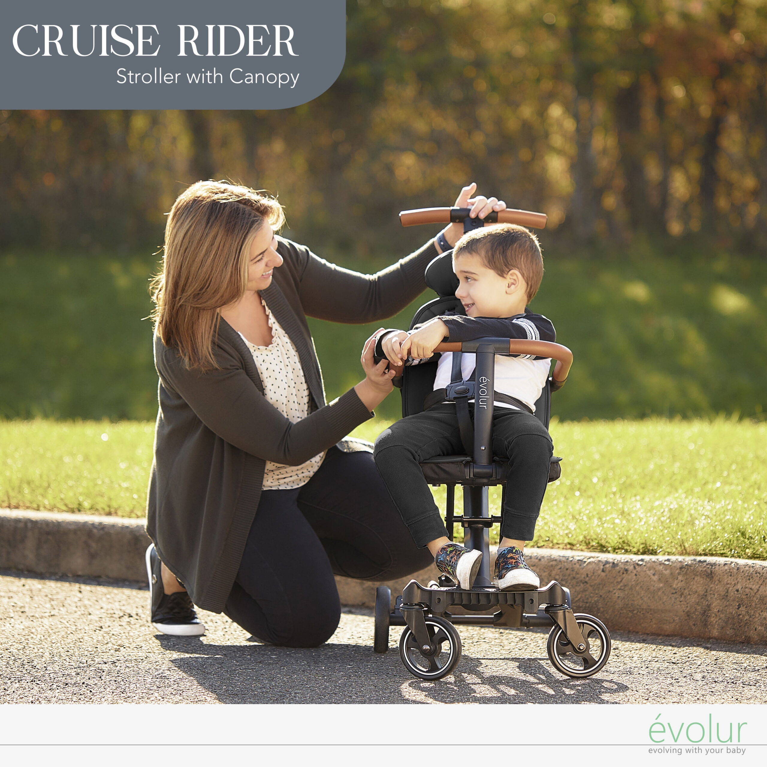 Let your little one discover the world from the lap of luxury aboard the Evolur Cruise Rider Stroller with Canopy! A proud winner of the 2023 NAPPA Awards, this one-of-a-kind stroller is loaded with features for those afternoon walks, grocery runs & family outings. This compact stroller folds inwards like a book in seconds, easily reclines & can be carried on your shoulder everywhere (Carry Belt included). With a high-density, durable handle & bumper grip (optional closed bumper & T-bar), front wheels with suspension, and a one-touch link brake, the Cruise Rider Stroller with Canopy is crafted for easy maneuverability. By effortlessly converting to a Scooter & Rider, this innovation-driven stroller combines flexibility and functionality. Safety comes first as this stroller comes with a 5-point safety harness and meets/exceeds ASTM, CPSC & Federal Flammability standards. Maximum comfort for your child with a plush seat, padded headrest & extendable backrest for taller babies. The Cruise Rider Stroller with Canopy comes with accessories like the Cruise Rider Twin Connector, Storage Basket, Rain Cover & a fun Scooter front (All sold separately). Easy to maintain by wiping with a damp cloth & air dry.