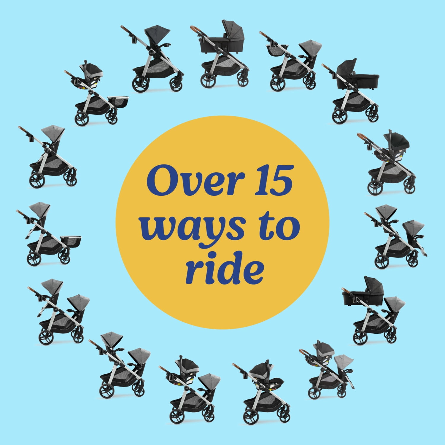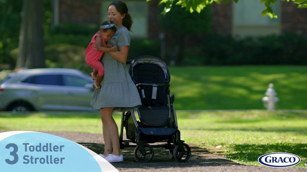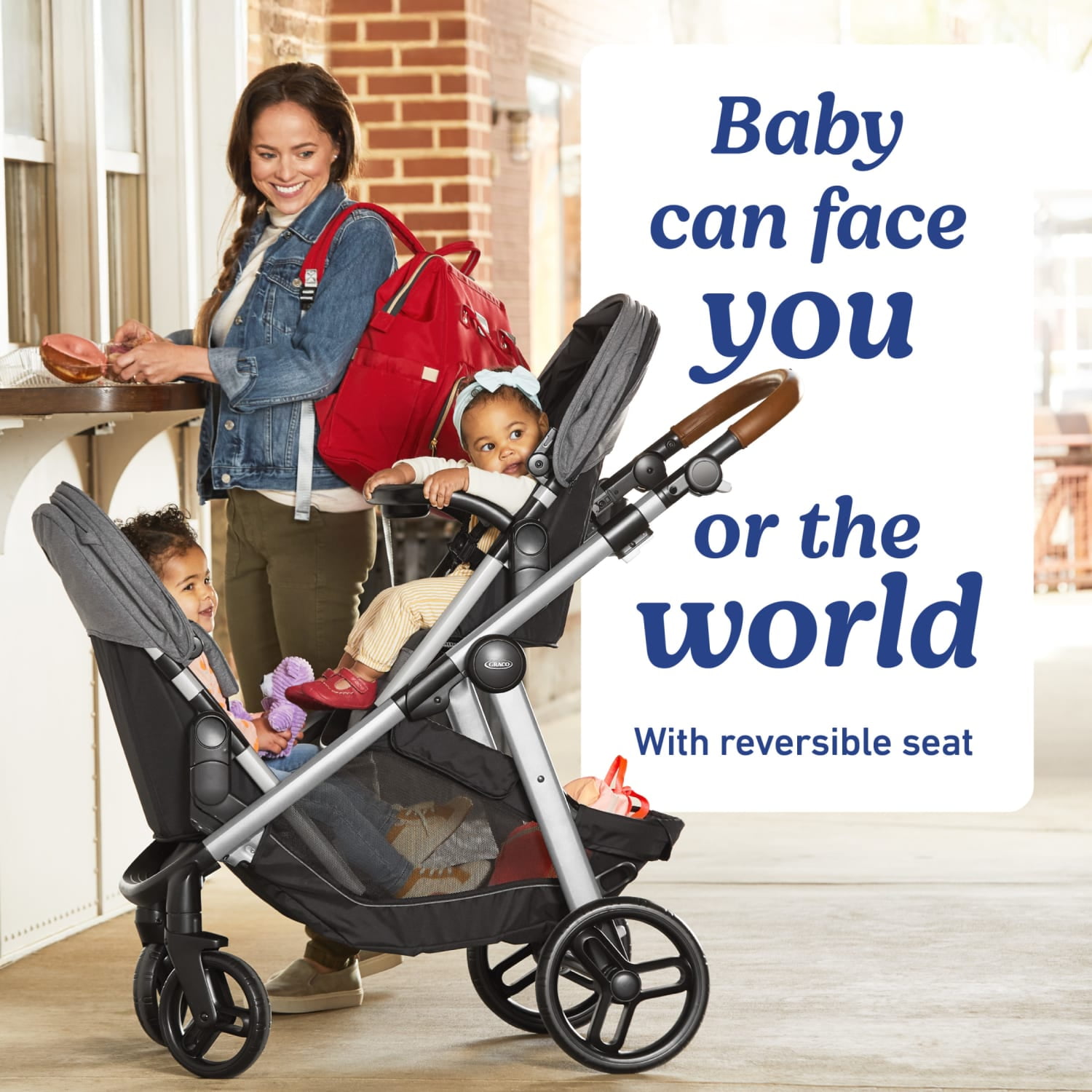The Graco Modes Nest2Grow Stroller grows from a single to double stroller with the addition of an infant car seat, carry cot, or second seat (each sold separately), for 15+ ways to ride. It’s the only stroller you’ll need for a growing family, but it’s the size of a single stroller perfect for first-time parents, too. The Slide2Me height-adjustable seat has 3 height positions to bring baby closer while making extra room for the second seat when baby number two is on the way. The reversible seat can face parent or the world for so many different ways to stroll. The one-step, self-standing fold makes transport and storage easy. A multi-position reclining seat helps keep your little one comfortable. When converted to a double stroller with second seat (sold separately), streamlined stacked seating provides a similar view for both children and makes getting in and out easier. The removable child’s tray with cup holder and removable parent cup holder keep drinks and snacks within reach. The expandable canopy has 2 positions for sun protection.